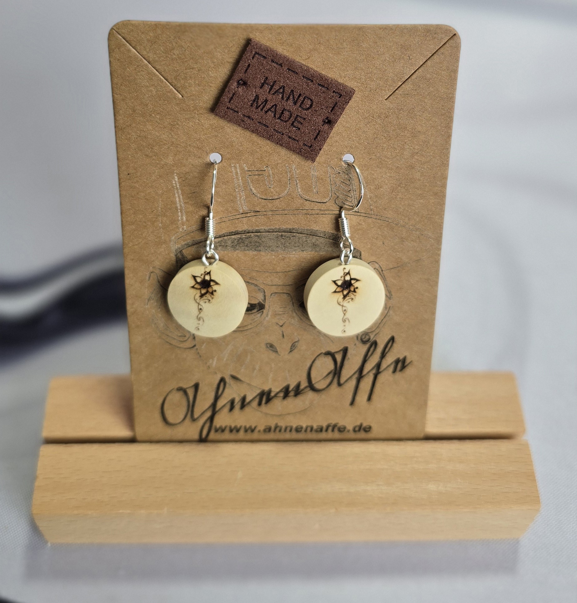 Funkelnde Akzente aus der Natur: Diese handgefertigten Holzohrringe fangen die Schönheit einer stilisierten Blüte in einem einzigartigen Design ein. Jeder Ohrring besteht aus einem kleinen, runden Holzstück, in dessen Mitte eine eingebrannte, sternförmige Blüte mit feinen Linien und einem dunkleren Zentrum sitzt. Von der Blüte nach unten zieht sich ein zarter, eingebrannter Strich, der an einen stilisierten Stängel erinnert.