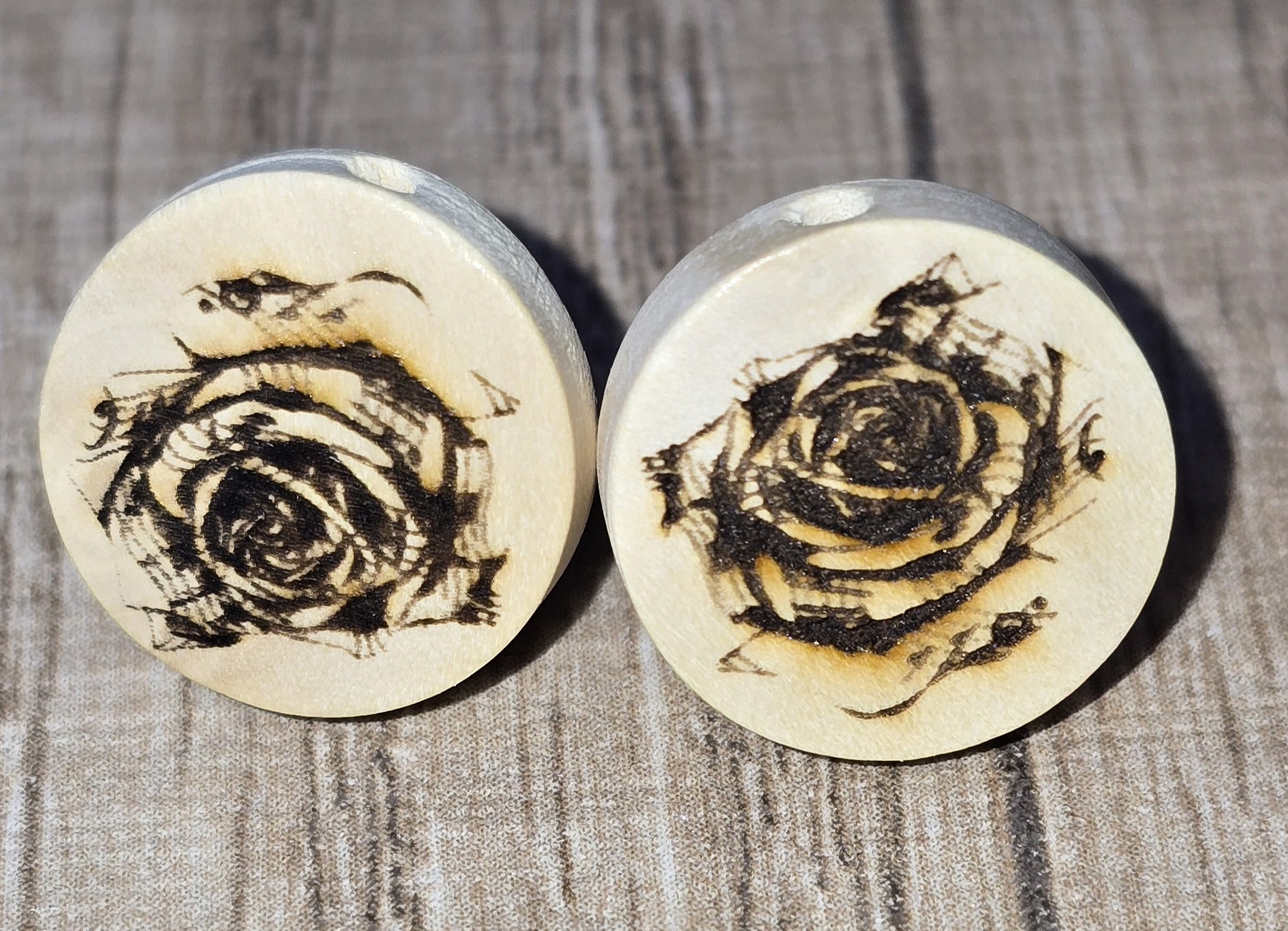 Entdecke die zeitlose Schönheit dieser Holzohrstecker mit einem kunstvoll eingebrannten Rosenmotiv! Die detailreichen Blütenblätter und die zarten Schattierungen fangen die Eleganz und Romantik der Rose auf natürliche Weise ein.