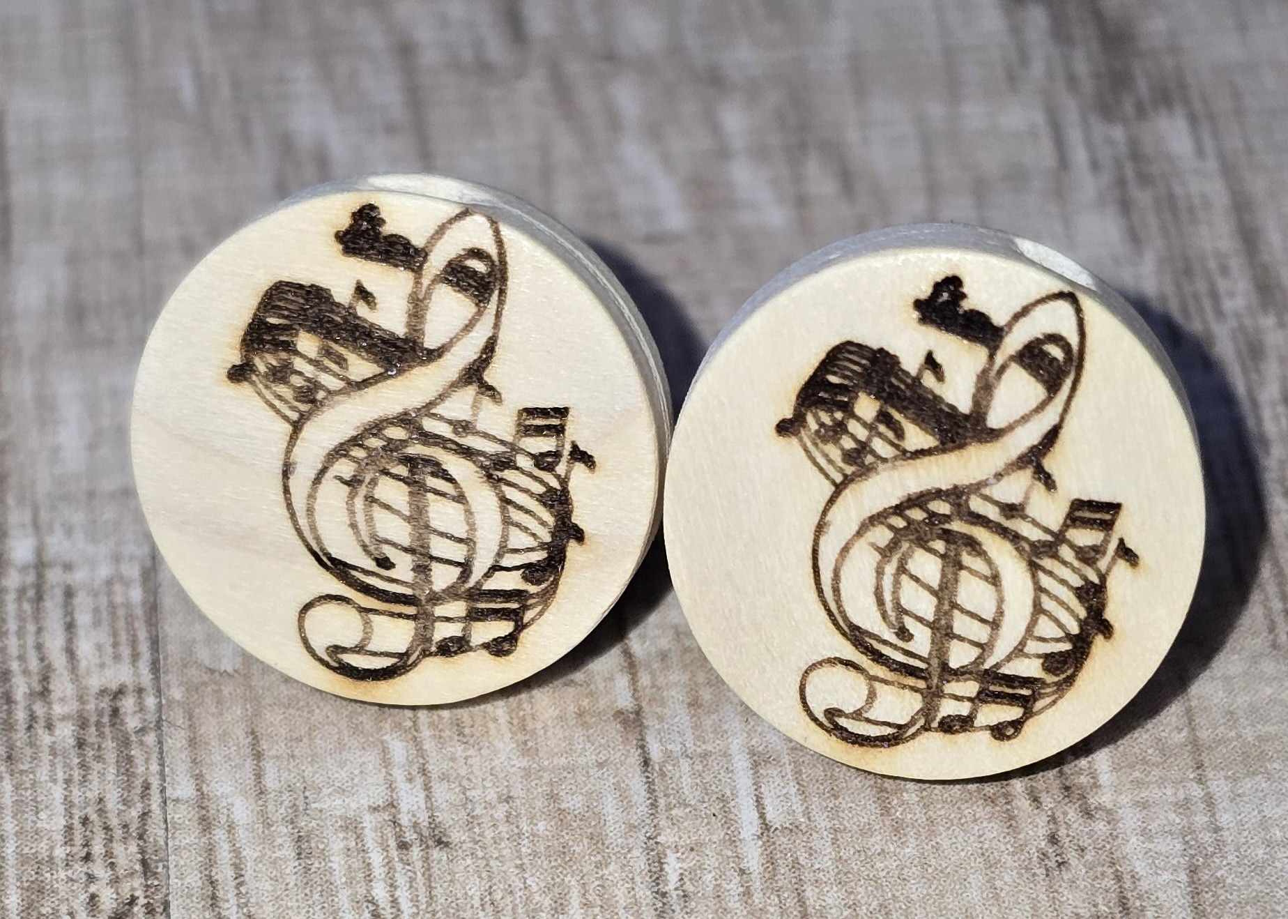 Lass deine Ohren im Rhythmus schwingen mit diesen musikalischen Holzohrsteckern! Das eingebrannte Motiv zeigt einen eleganten Violinschlüssel, umgeben von Notenlinien und einzelnen Noten, die eine Melodie andeuten.